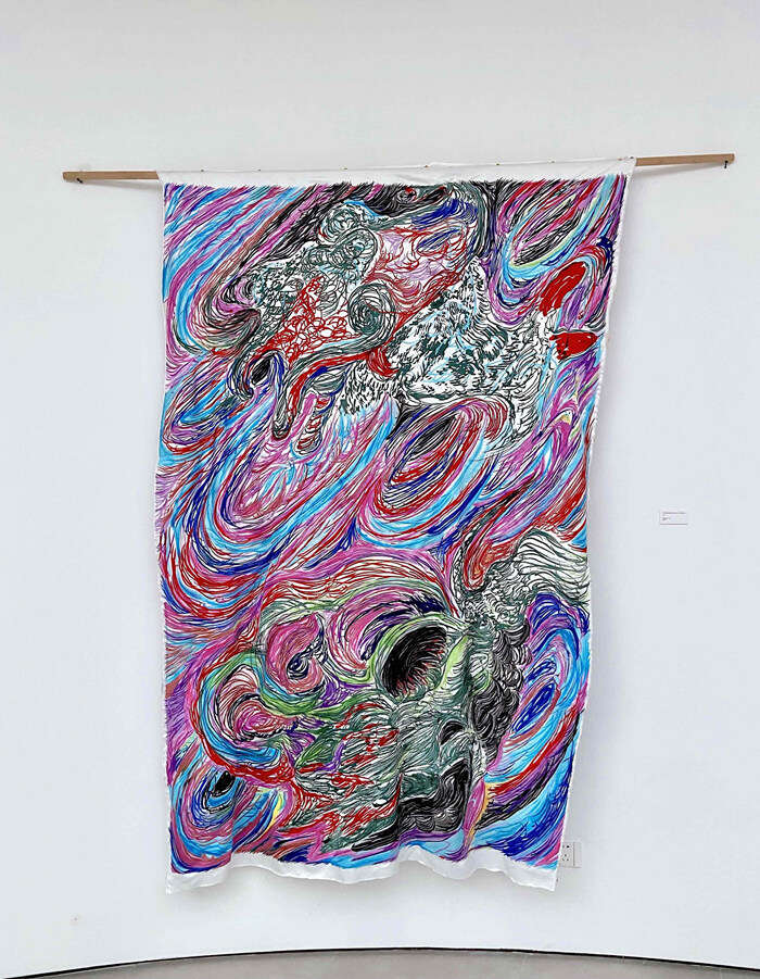 作为一位以多种绘画媒介及文字创作的艺术家,于艾君此次带来了基于刺绣的全新作品。通过在河北、苏州多地的研究考察,他和绣工合作创造出将刺绣之严谨、涂鸦之即兴融为一体的独特风格。这既是其个人创作的再次蜕变,也可视为对绘画程序及材质的大胆突破。