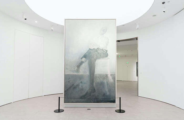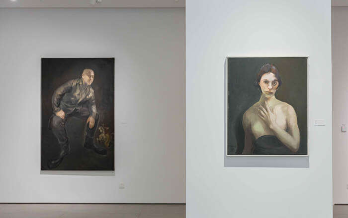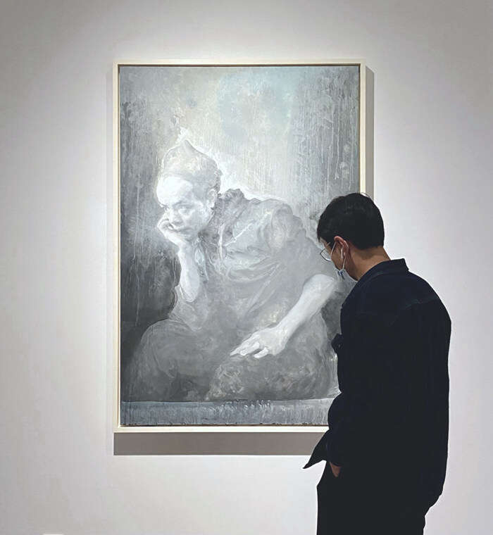 展出的毛焰珍藏作品包括一幅高达3.3米的《椅子上的托马斯》,该画是毛焰在其“托马斯”系列作品中极为重视的一件,长期放置在工作室中,几乎不曾对外展出过。此次展览将这幅巨作单独置于展厅中央的一处圆形空间内,以其庞然的体量和富有哲思的气质震慑人心。画中人物目光向上,仿佛穿透天顶、升向半空;我们凝视着他的凝视,与之共同沉入意识的凝聚或弥散状态。