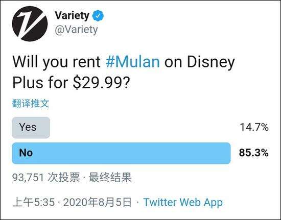 不过,高达29.99美元的价格,也让很多兴趣一般的观众望而却步。美国媒体《综艺》网站发起的一项关于“你是否会在Disney+上花29.99美元购买电影《花木兰》”的投票中,截至北京时间7日上午7时许已经有9万多人参与投票,其中高达85.3%的人表示不会花钱购买电影。