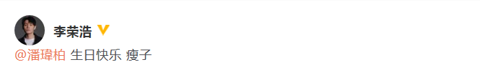 8月6日是潘玮柏40岁生日,李荣浩在微博为潘玮柏庆生,幽默调侃:“生日快乐,瘦子。”有粉丝评论:“你是啥子?”李荣浩机智回应:“男子。”