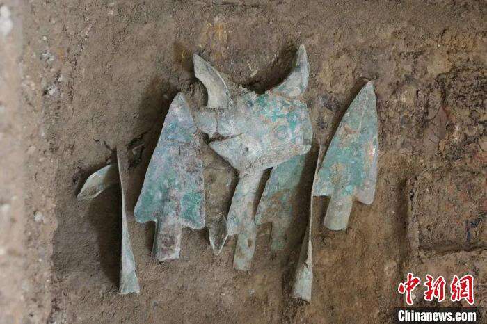 M2铜矛、铜兽面饰出土情况。 山西省考古研究院供图