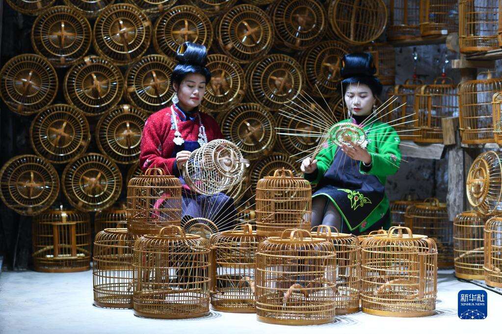 在贵州省黔东南苗族侗族自治州丹寨县卡拉村,鸟笼制作技艺非遗传承人王秋(右)在编制鸟笼(11月16日摄)。新华社记者杨文斌摄