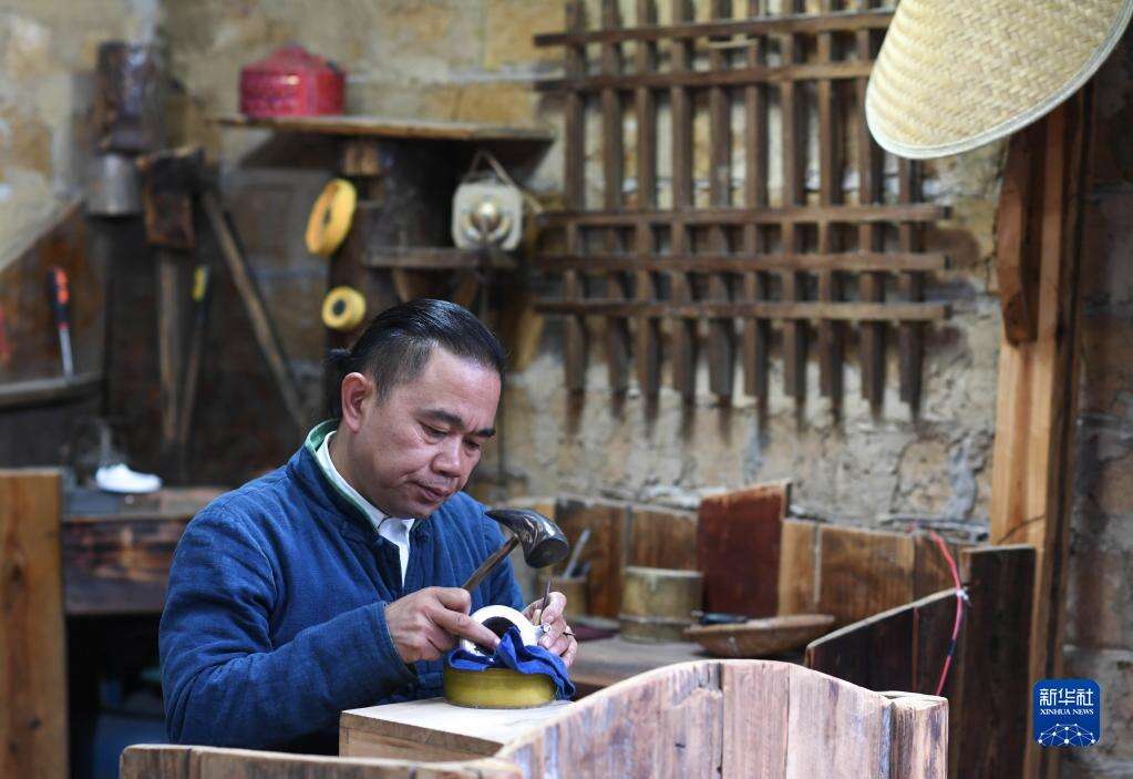在贵州省黔东南苗族侗族自治州丹寨县卡拉村,银饰锻造技艺传承人王国春在锻造银制器具(11月16日摄)。新华社记者杨文斌摄