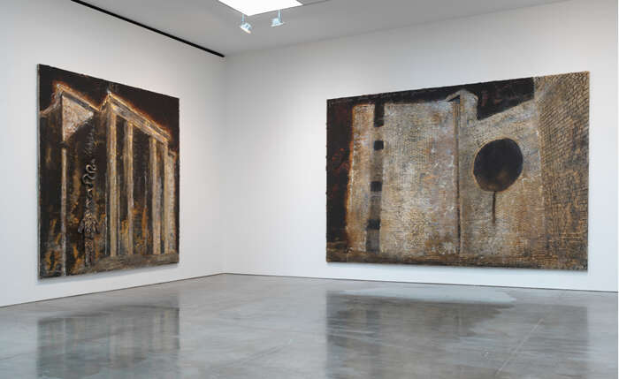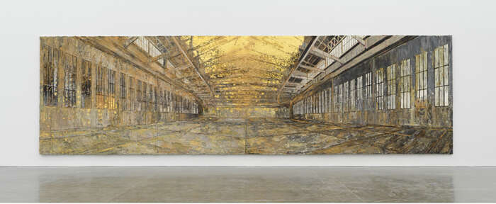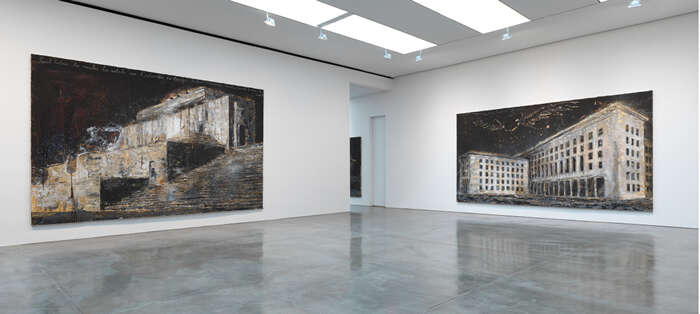 纽约的展览展出了纪念性建筑和废墟的画作。他们的建筑充满了“出埃及记”中的象征主义主题,这些主题由长期以来启发基弗的作家发展而来,包括保罗·策兰和埃塔·霍夫曼。 “达娜厄(2016-21)”将柏林滕珀尔霍夫机场广阔内部的场景与古希腊神话中的宙斯变身为黄金雨的神话,从而在画作中突出使用了大量金箔。这座著名的遗址兴建于中世纪属于圣殿骑士团的地区,于 1923 年作为机场综合体开放,在第三帝国时期得到广泛开发,并在冷战期间的柏林空运中发挥了关键作用。值得注意的是,废弃设施最近被用来为难民提供临时住所,将其与“出埃及记”的主题联系起来。画作中的其他建筑包括意大利的蒙特卡西诺修道院;阿尔贝特·施佩尔(Albert Speer )在德国纽伦堡的齐柏林看台;和位于印度艾哈迈达巴德的路易·卡恩(Louis Kahn)的管理学院—所有在历史和文化上引起的共鸣。