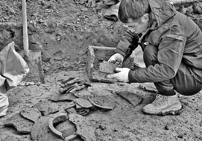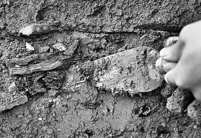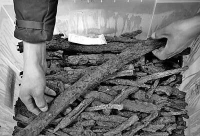 考古工作人员在河南商丘宋国故城遗址发掘现场清理地层剖面上的柏木。新华社记者 李安 摄