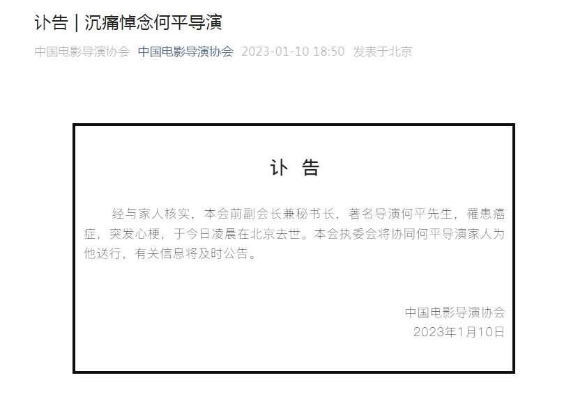 中新网1月10日电 据中国电影导演协会消息,经与家人核实,中国电影导演协会前副会长兼秘书长,著名导演何平先生,罹患癌症,突发心梗,于1月10日凌晨在北京去世。中国电影导演协会执委会将协同何平导演家人为他送行,有关信息将及时公告。