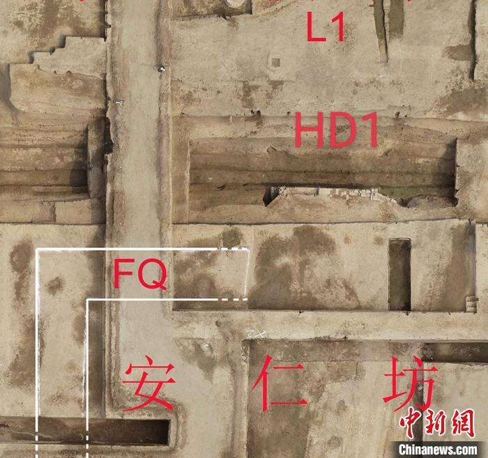 安仁坊西北角坊墙、角门与门外水渠上的涵洞航拍图。 陕西省文物局供图