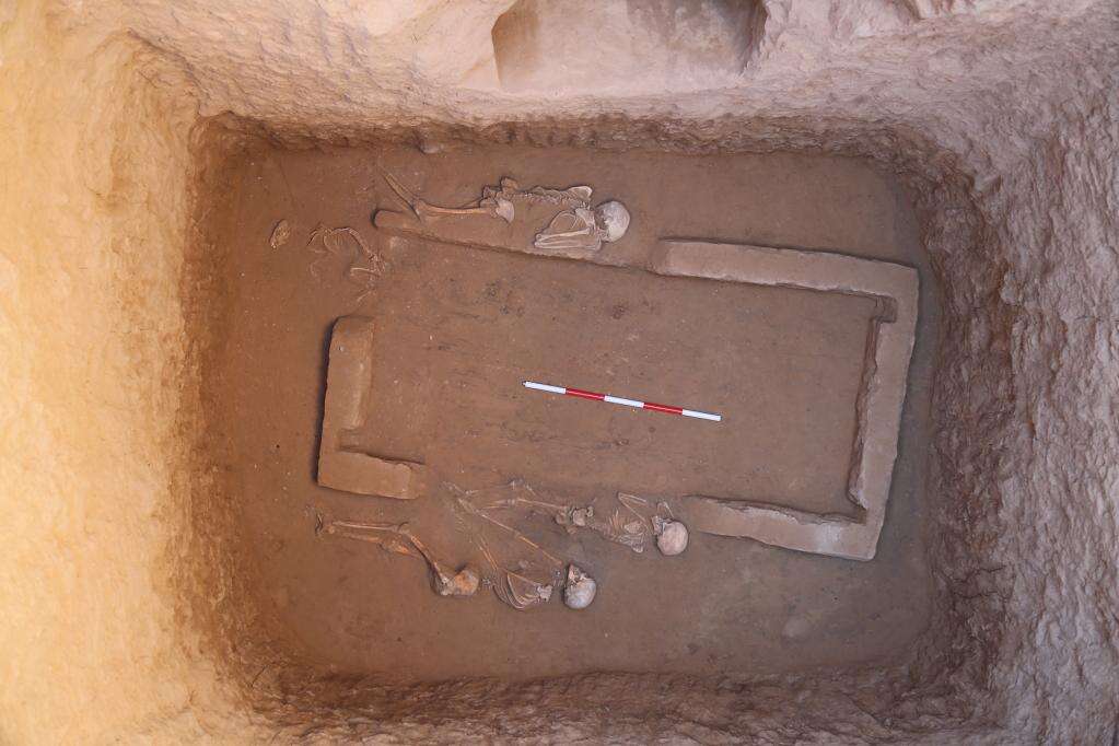 1月12日,2022年度陕西重要考古发现新闻发布会在西安举行。陕西省考古研究院研究馆员邵晶在新闻发布会上介绍了石峁遗址的最新考古发现。这次发现的墓地由一道宽约4米的石墙与皇城台核心建筑分布区隔开。15座竖穴土坑墓可分为南北两区,其中南区墓葬等级更高,平面为圆角长方形,墓室面积普遍超过10平方米,深3.5米至4米。墓葬普遍使用木质棺椁,由榫卯套接而成,已朽为灰痕,墓内普遍殉人。因遭严重盗扰,墓主葬式不详、壁龛中多数器物已被盗。个别墓葬内壁龛未遭破坏,出土有整套完整陶器,器表施红色彩绘。在个别墓葬棺内及盗洞中发现有少量玉器及残片,可辨识的有钺、凿、环等。