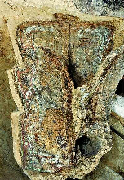 图为秦始皇陵兵马俑陪葬坑一号坑第三次考古发掘发现的盾。秦始皇帝陵博物院供图