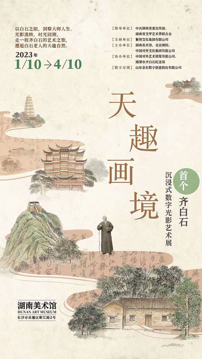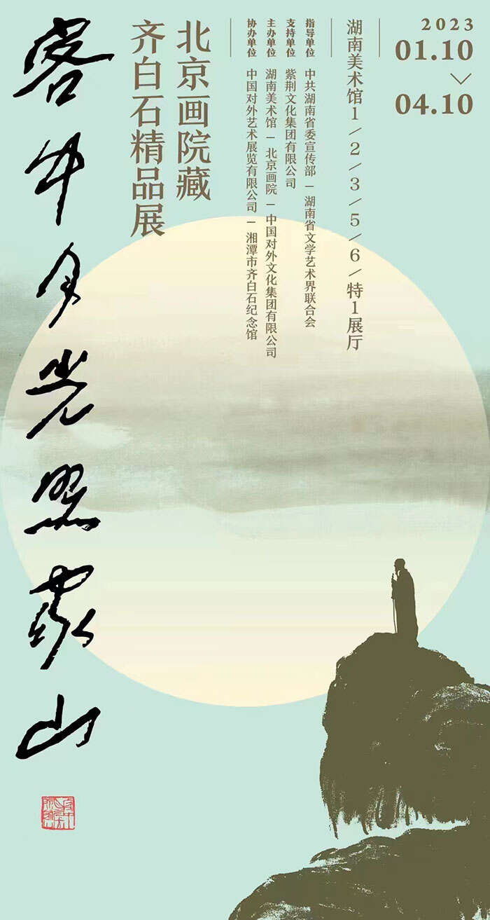 2023年1月10日,癸卯新春到来之际,由中共湖南省委宣传部、湖南省文学艺术界联合会指导,紫荆文化集团有限公司支持,湖南美术馆、北京画院、中国对外文化集团有限公司主办,中国对外艺术展览有限公司、湘潭市齐白石纪念馆协办的大型展览“客中月光照家山——北京画院藏齐白石精品展”在湖南美术馆与观众朋友们见面。
