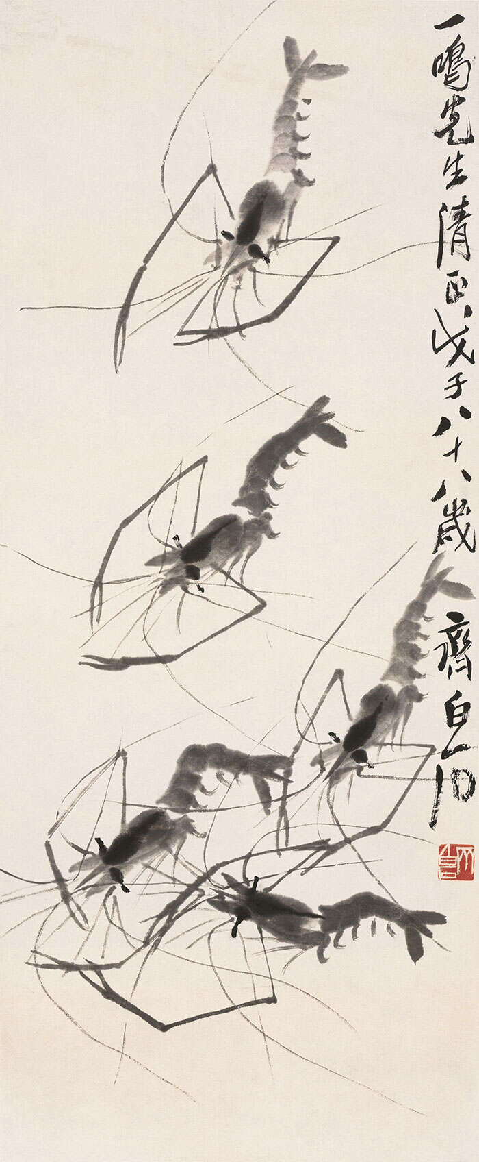 起初临摹古人,形象略似。63岁前后,他开始对着案头水盂里养的青虾写生,初具形似,不过对虾的透明质感和动态层面还未达到深度刻画。68岁,他以墨色的浓淡来表现虾体的质感,虾须变得更有弹性,生动地展现出虾在水中游曳时的状态。不过他仍未满足,80岁时齐白石在虾头间点上一笔焦墨,干脆老辣,同时还在长须之间增加了短须。长须柔软而有弹性,短须坚硬而有韧性,形成鲜明对比,真正达到了炉火纯青的境界。此次展览将齐白石不同时期的画虾作品进行了集中展示,更能让观众发现其中细节的变化以及老人在创作背后所花费的苦心。
