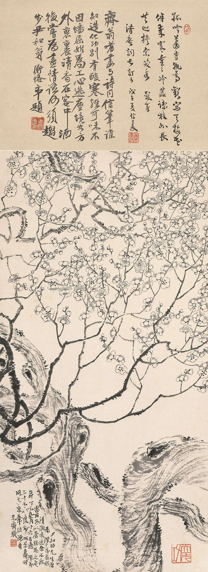 此次展出的《墨梅图》正是齐白石与陈师曾二人情谊的重现。1917年,齐白石二上北京,结识了一生中重要的几位朋友,同时也逐渐融入了北京的文化圈,其中最重要的便是陈师曾。陈师曾在《墨梅图》题诗: