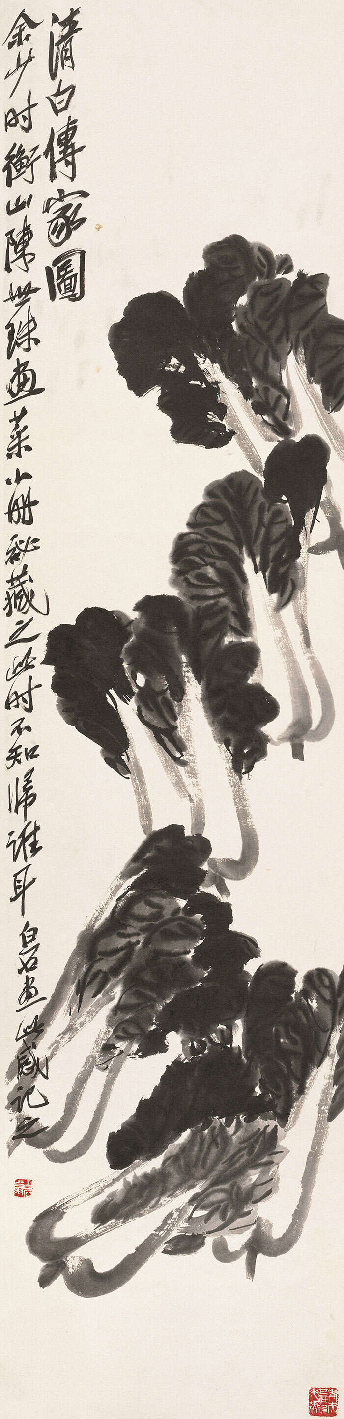 因为生于“糠菜半年粮”的穷人家,所以白菜、萝卜等平民百姓饭桌上常见的食材,也就成为齐白石艺术创作反复表现的对象。他还曾专为白菜赋诗,“不是独夸根有味,须知此老是农夫”,念念不忘“先人三代咬其根”,认为“菜根香处最相思”。白石老人常以青白菜谐“清白”之音,故而一生喜画白菜,并以自己画面洋溢的“蔬笋气”为荣。而“清白传家”这一主题又将几株白菜的含义升华到更高的境界。可见,他是在用白菜解释和规范自己的行为,以自己的实际能力,做着适合自己自然本性的事情,从而表达对世界、对人生、对艺术的看法。