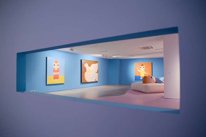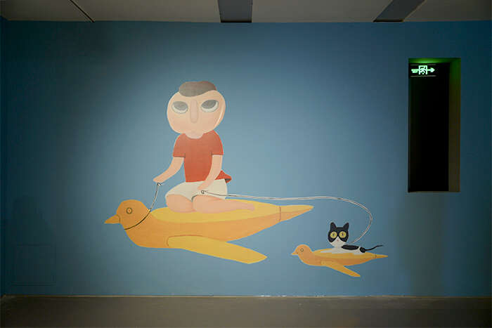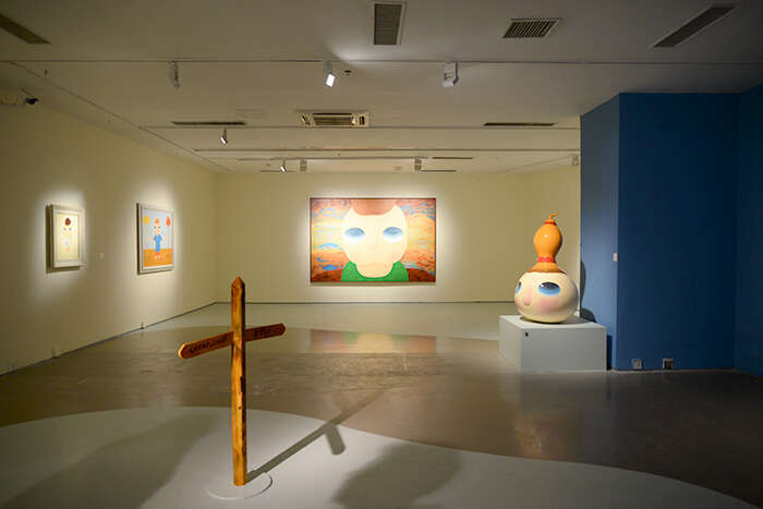 此次展览分布在展厅的上下两层空间,较为全面地展示了蔡万霖在不同时期的创作成果。色彩、流线形的地贴贯穿起整场展览的视觉统一性,而每个单元的故事也由不同的颜色划分。展厅一层将向观众呈现艺术家的创作手稿及其它文献资料,深度展示其艺术创作的理念和幕后故事;除绘画、雕塑作品外,艺术家还为本次展览全新创作了陶瓷、炫彩及马赛克作品,这些新作与数字艺术作品展示区一同设置于展厅二层,呈现出艺术家对于新技术和数字媒介的运用。值得一提的是,开凿在展墙上的“小窗口”设计生动还原了作品《我要飞》中所描绘的“安全出口”。“小窗口”所构建的空间“透视感”使观众的视线得以“穿透”展墙,望向由另一种色彩主导的叙事单元,极大程度上丰富观展时的视觉冲击感与韵律感。