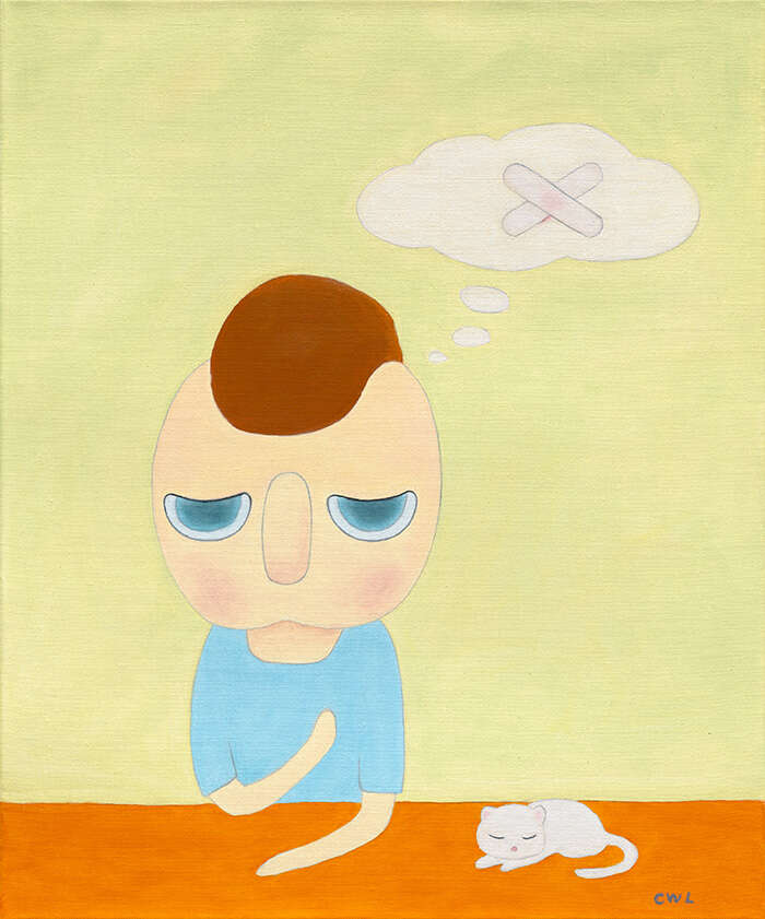 展览的第四部分《我的伤心云知道》既是展览的一个篇章,也是整个展览的主题。画中的人物形象手扶胸口,聊以慰藉的是创可贴的拥抱与身旁小猫的陪伴,至此化身成为困境中尝试自我疗愈并达成身体与精神相互慰藉的个体。