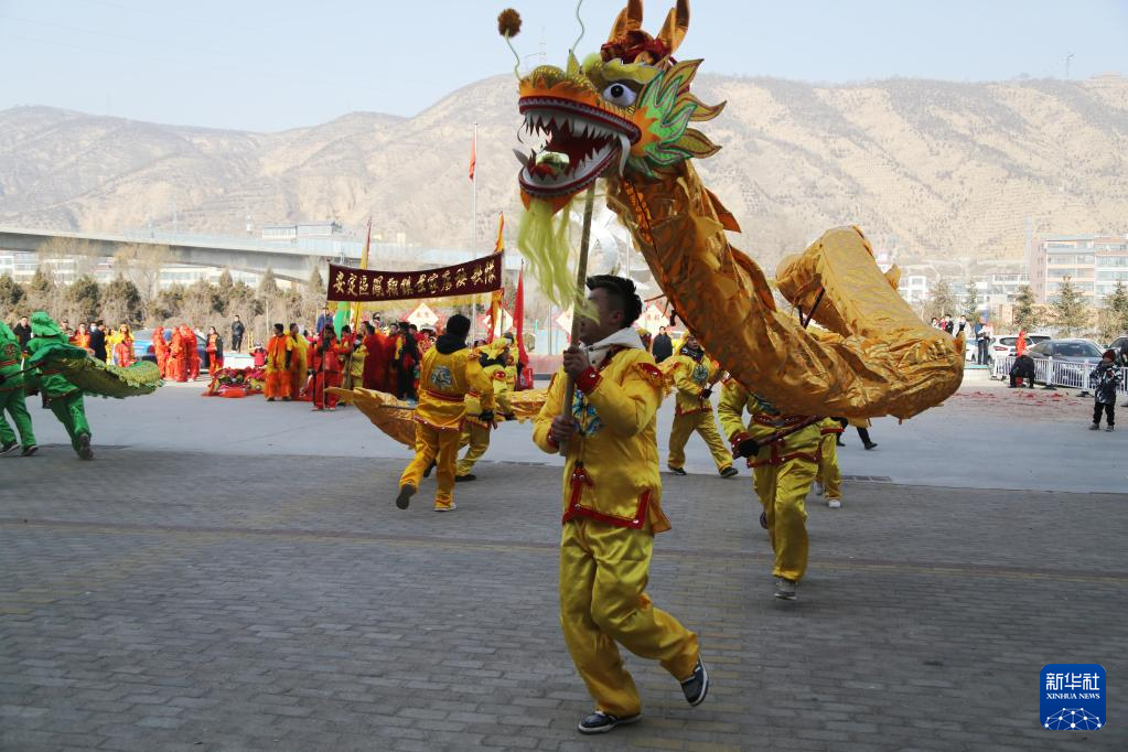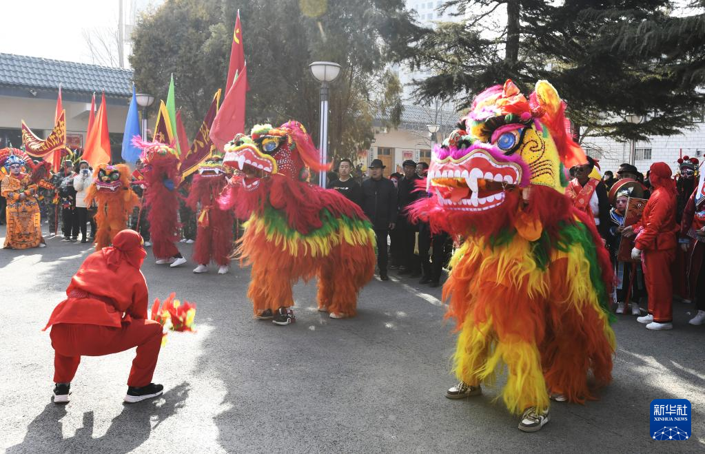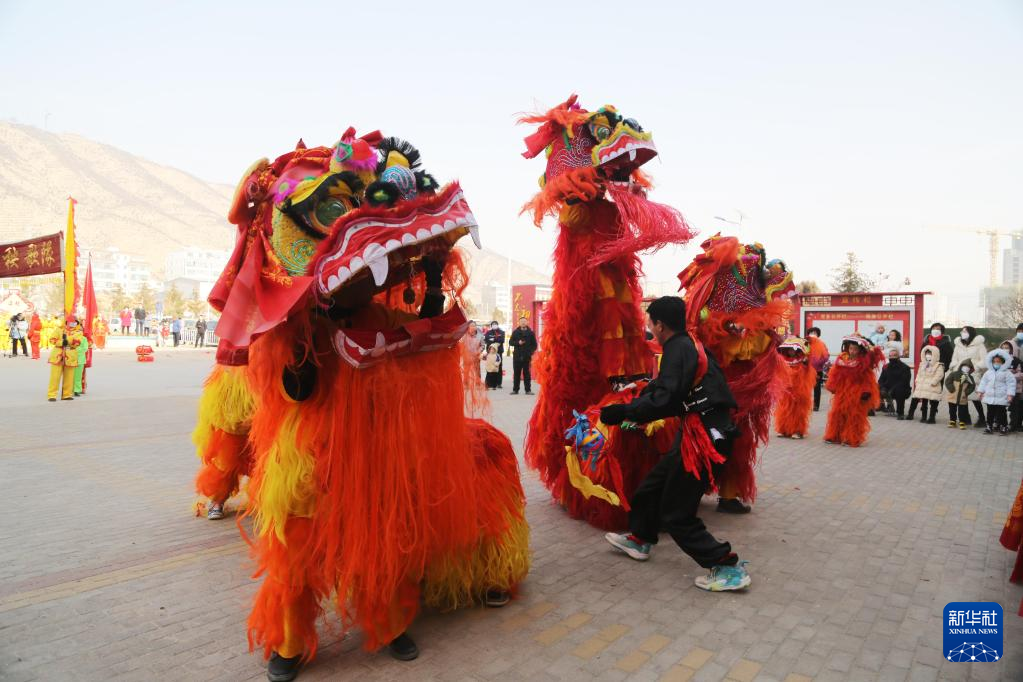 1月30日,在甘肃省永靖县太极镇,村民表演舞狮。
