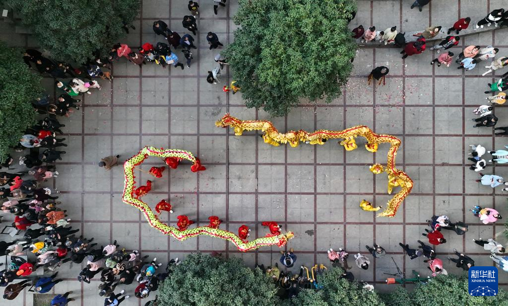 1月31日,艺人在湖南省衡阳市珠晖区东风街道前进里社区表演舞龙(无人机照片)。