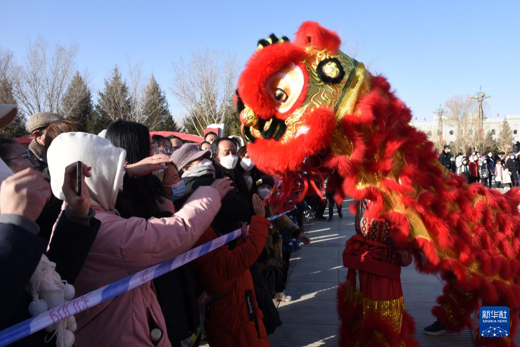 1月30日,在甘肃省阿克塞哈萨克族自治县,社火队员在表演舞狮。