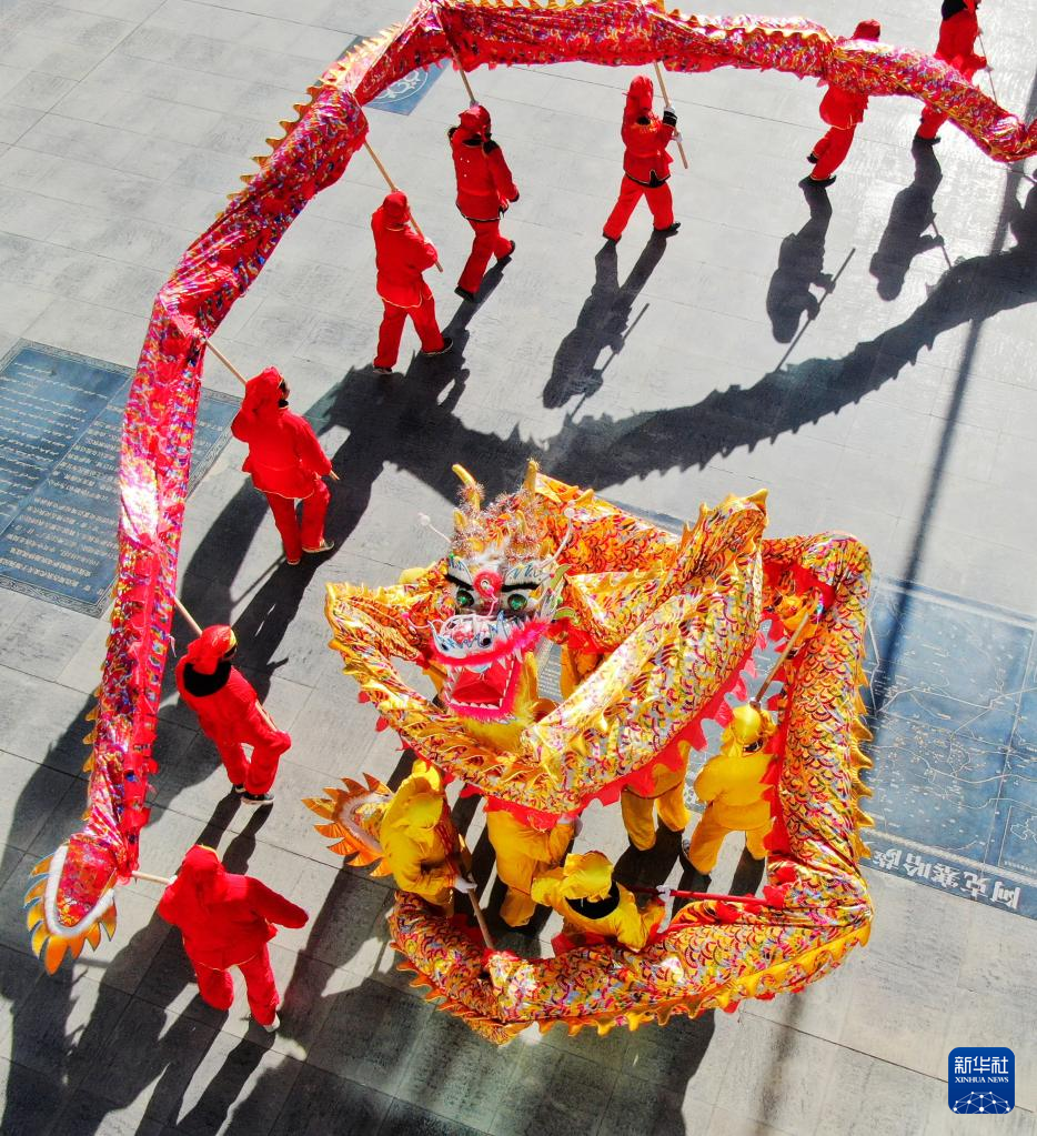1月30日,甘肃省阿克塞哈萨克族自治县社火队在表演舞龙(无人机照片)。