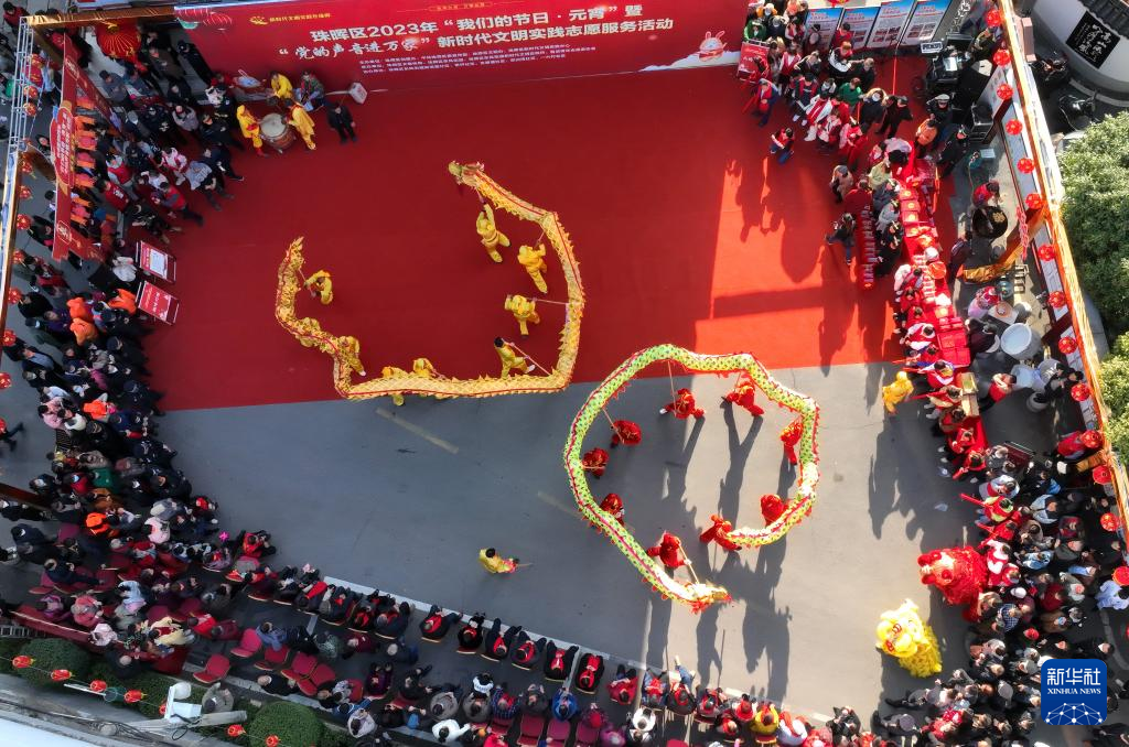 1月31日,在湖南省衡阳市珠晖区东风街道前进里社区,人们舞龙舞狮迎接元宵节的到来(无人机照片)。