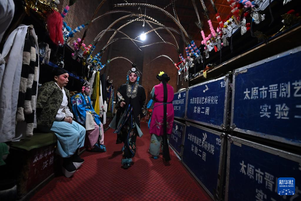 1月30日,在山西省太原市清徐县孟封村,太原市晋剧艺术研究院实验二团演员在后台准备上场。