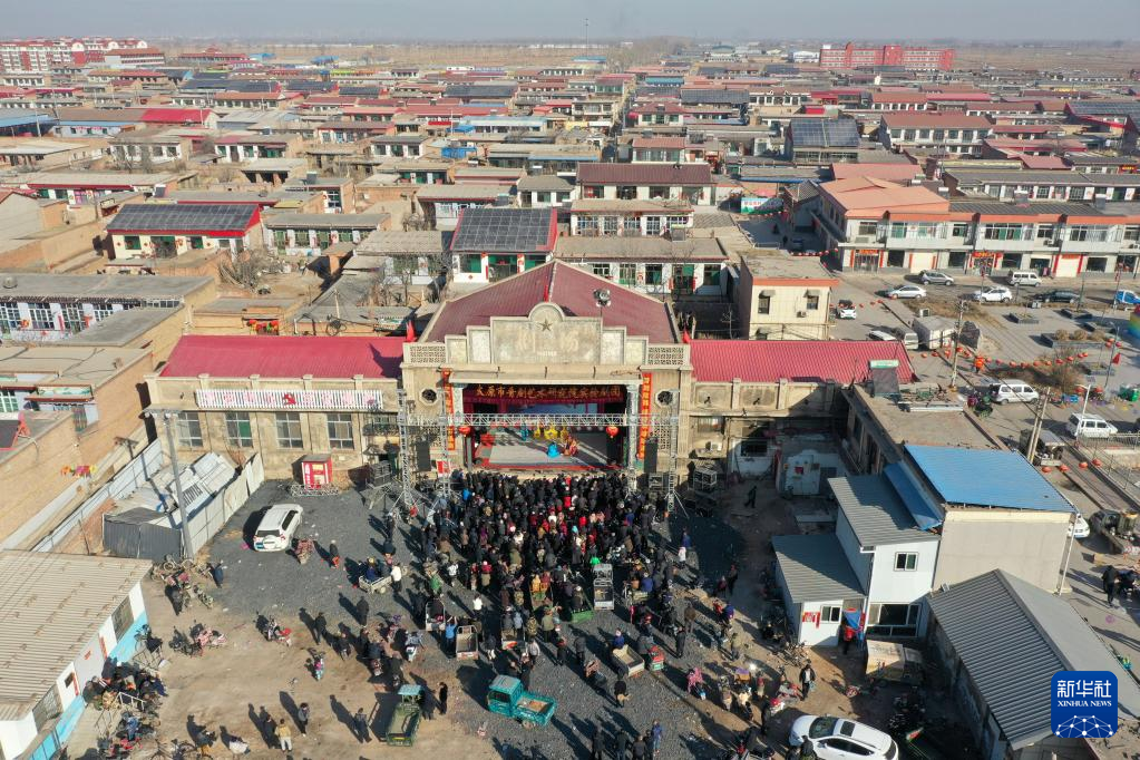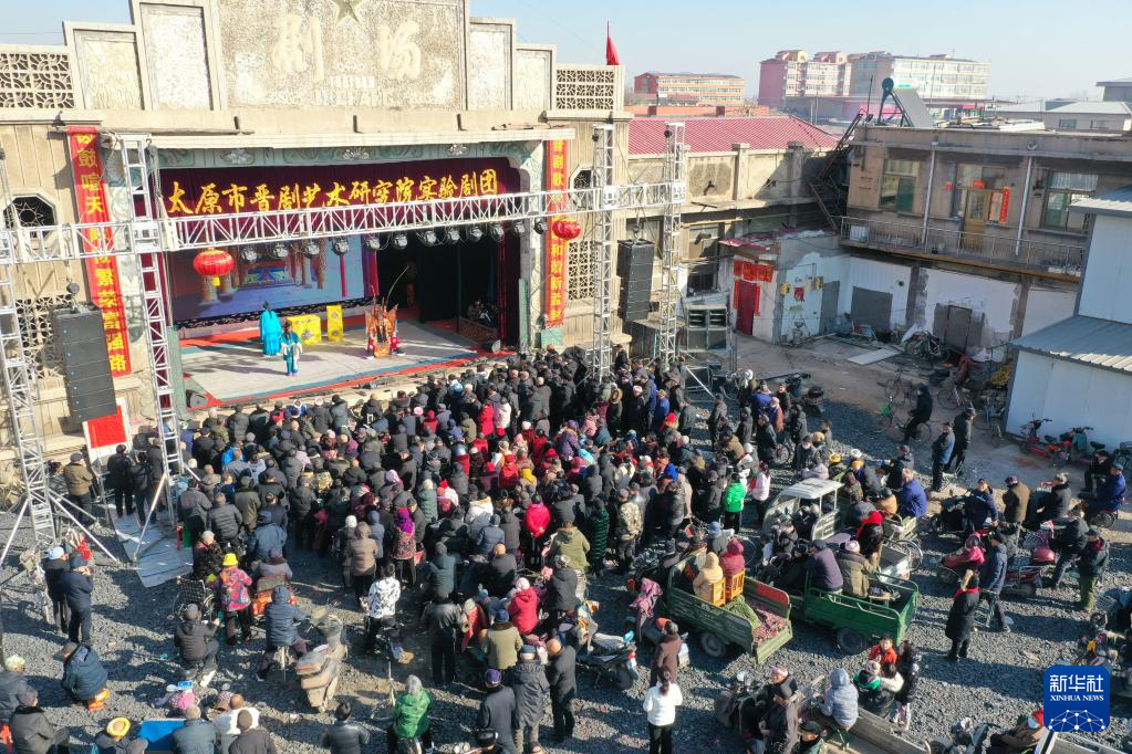 1月30日,太原市晋剧艺术研究院实验二团演员在山西省太原市清徐县孟封村演出(无人机照片)。