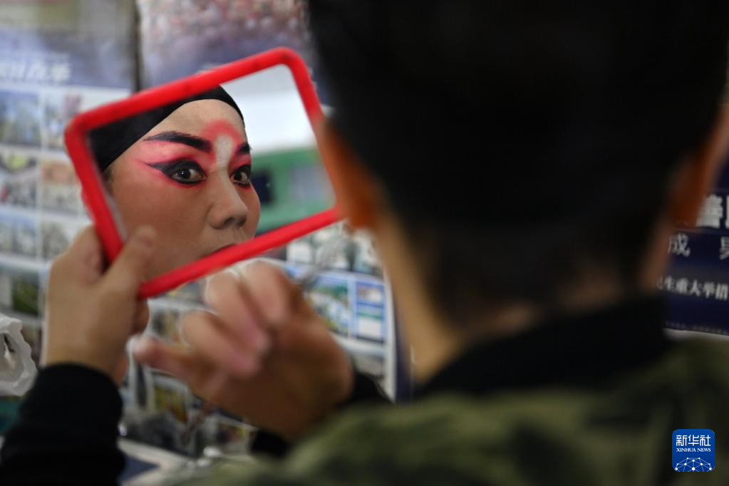 1月30日,在山西省太原市清徐县孟封村,太原市晋剧艺术研究院实验二团演员在后台化装。