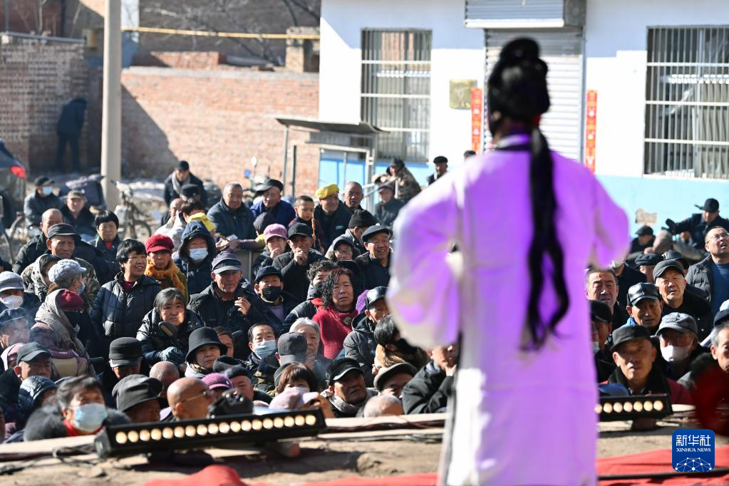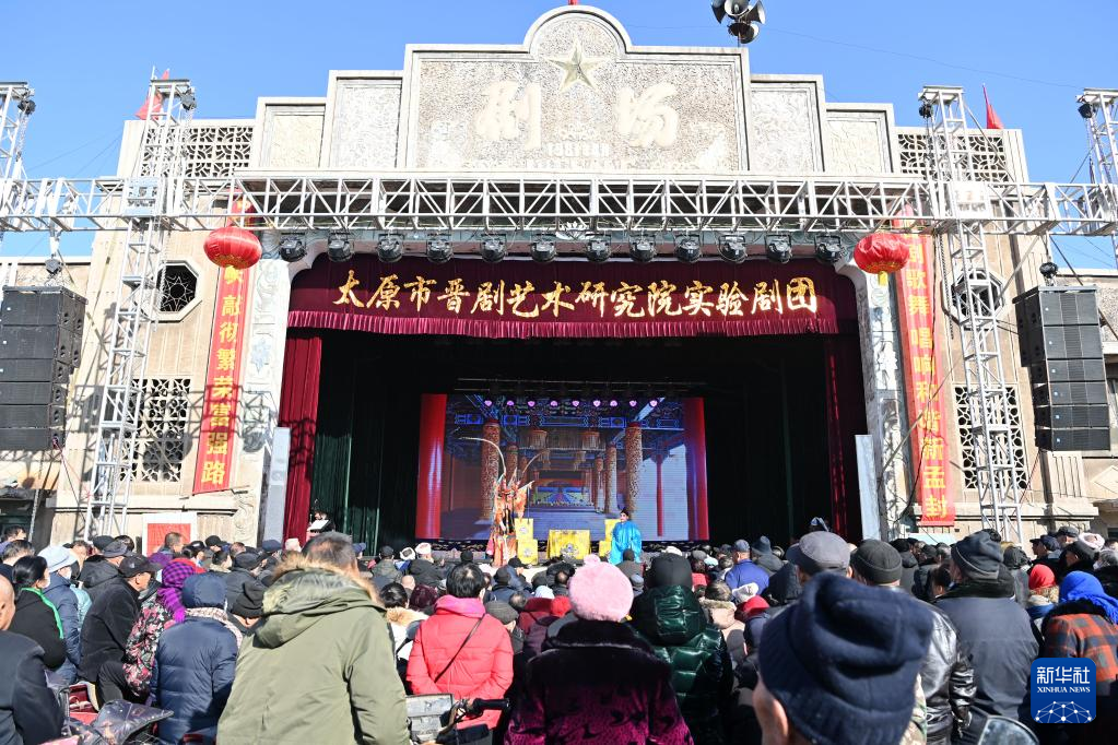 1月30日,在山西省太原市清徐县孟封村,村民观看太原市晋剧艺术研究院实验二团演员演出。