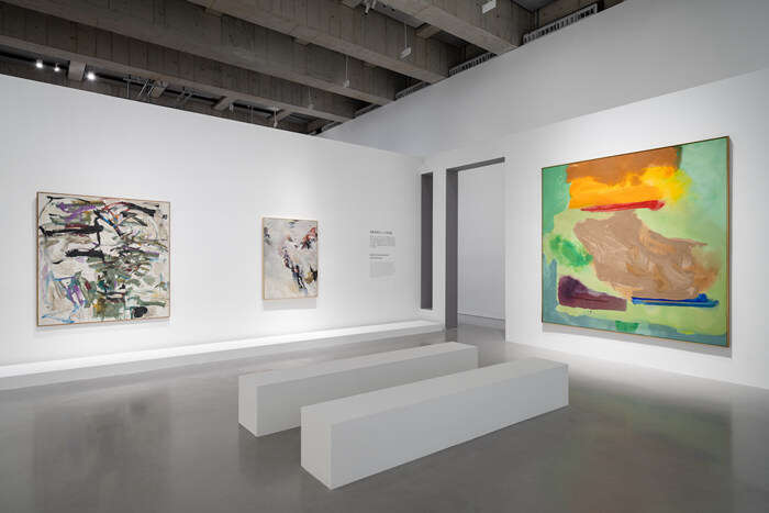 1950年代被认为是抽象表现主义的顶峰时期,强调身体行动与情感表达的自发性与即时性。琼·米切尔是少数融入抽象表现主义圈子的女性之一,在她漫长而多产的职业生涯中,米切尔世界的重要元素水、树木、诗歌、音乐组成了她工作的图像和记忆。她曾说:“我根据随身携带的记忆中的风景画画,并记住它们的感受,这些感受当然会发生变化。我也永远无法反映自然,但我更想画出它留给我的东西。”她的画面给人一种能量正在生长的印象,鲜艳的短笔触断断续续与大量的丰富带状交错在一起,唤起生长或季节的转变,现场展示了她多幅作品,包含《天是蓝的,草是绿的》、《再见之门》。深蓝色、青绿色就像将大地、树木、天空和水都紧密地联系在一起,每一个元素都变得模糊无法区分。