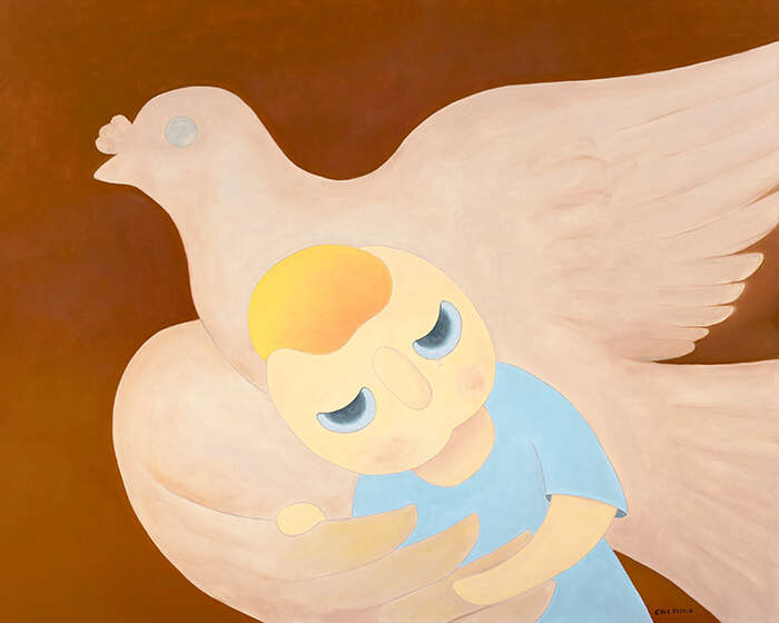 比如我在2022年创作的《和平》,虽说我们身处的这个世界中依然有冲突、暴力、贫穷,但是回看我们国内和平安宁的这种生活状态,就更应该倍感珍惜,更应该拥抱和平。所以我在创作这幅作品时就展现了和平鸽与“yy”之间的一种互动关系,两者之间是一种互相拥抱的状态。“yy”用手轻轻抱住和平鸽翅膀的动作,就是想要留住和平,保持和平。