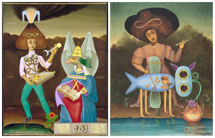 维克多·布劳纳,1947,左图:“爱人”(The Lovers),巴黎蓬皮杜中心藏;右图:“超现实主义者”(The Surrealist),1947,佩姬·古根海姆美术馆藏
