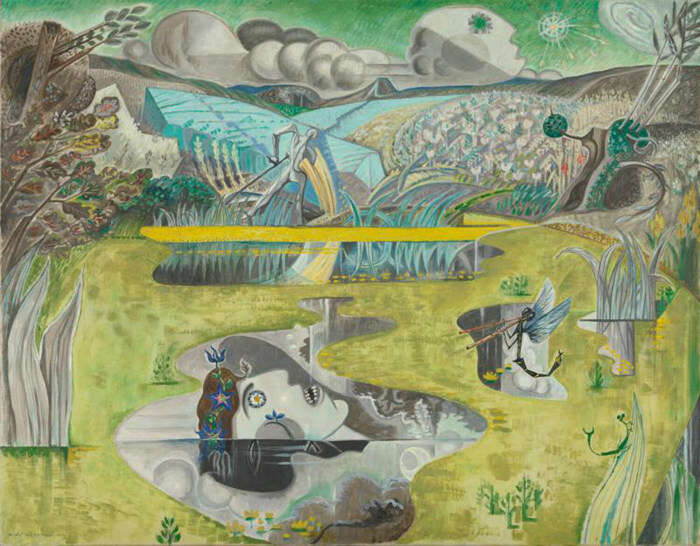 法国画家安德烈·马森将生死轮回赋予在了莎翁戏剧的二创上,哈姆雷特的未婚妻奥菲丽娅在溺水中等待重生,图中吹奏双笛的蜻蜓寓意着蜕变与转化。马森是第一批有意识去探索无意识的画家之一,他与法国精神分析学大师拉康是连襟,作为弗洛依德之后最具原创性的心理分析学家,拉康与马森想必进行过不少“精神”对话。