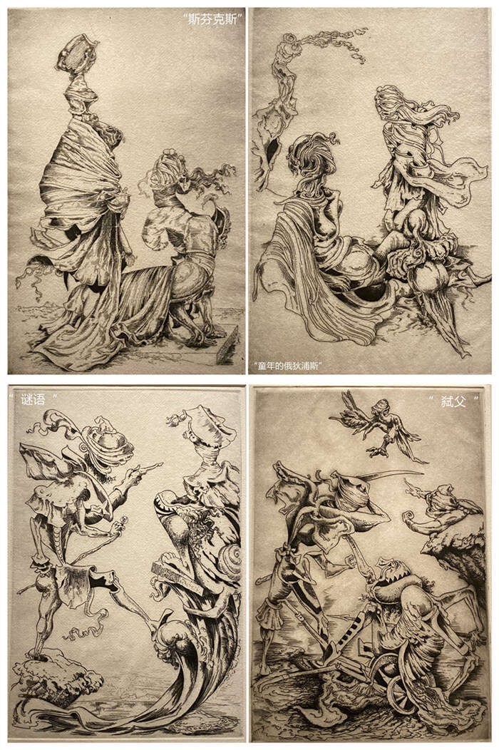 塞利格曼的个人烙印属实浓烈,即便是描绘被翻来覆去画过无数次的古希腊神话“俄狄浦斯”也能让人眼前一亮。古老神话是魔法世界重要的组成部分,对超现实主义者来说,这当然是运用想象力与创造力展现自己“魔法”的绝佳时刻。在赛里格曼的这组系列蚀刻版画中,俄狄浦斯和斯芬克斯之间的极限拉扯正是理性与非理性对抗的象征。