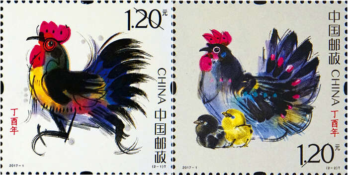 第一枚邮票名称为:“意气风发”。邮票中的公鸡昂首阔步、雄姿勃发,名曰“意气风发”,寓意“国”之概念;第二枚名称为:“丁酉大吉”,邮票中母鸡慈爱,幼鸡憨萌,名曰“丁酉大吉”,寓意“家”的温情。