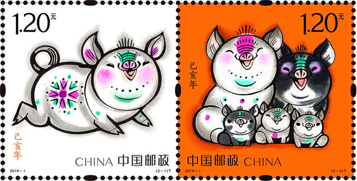 第一枚邮票名称为:“肥猪旺福”,以奔跑的动态表现灵动生风的喜感,象征着正在奔向美好的生活;第二枚名称为:“五福齐聚”,是首次在一枚生肖邮票中完整体现“全家福”的概念,寄托新春佳节合家团圆、五福临门的美好祝福。