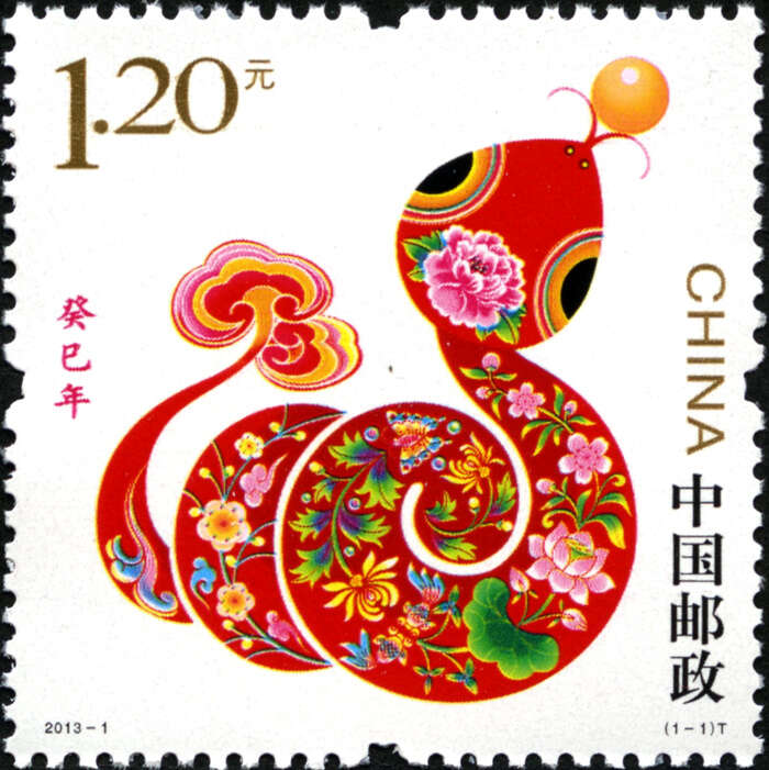 邮票一套1枚,底色为白色,一条红色花蛇跃然纸上,蛇身上装饰有春桃、夏荷、秋菊、冬梅等图案,同时,蛇首口衔一颗金黄色圆珠,蛇尾端绽开两朵祥云。