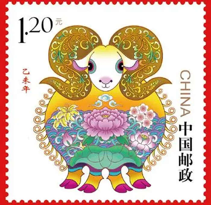 邮票以绵羊为原型,融合了中国民间一些美好的意愿,小羊瞪着一双黑亮的大眼睛憨态可掬,羊角的缠枝花草纹样,象征福气延绵不绝,长长久久。整个小羊采取正面造型,吸收了典型的中国花瓶造型,取“瓶”字的谐音“平”平和、平安之意,小羊身上也即花瓶上的牡丹、荷花等代表四季的花卉,寓意四季平安。花的周围伴以流动的祥云、水波纹等吉祥纹饰,整体画面动静结合,色彩艳丽,充满喜庆的气氛,使整枚“羊”票体现了团结团圆、吉祥如意的美好寓意。羊两边为12卷毛,牡丹花为三层,寓意生肖邮票发行三轮,每轮12枚。