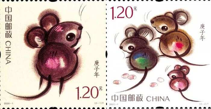 第一枚邮票名称为:“子鼠开天”,一只形象可爱的老鼠腾空跳起,抬头望天,奋力咬破混沌,寓意民间传说中的“鼠咬天开”,同时老鼠跳跃的姿态也寓意鼠年生活节节高之意;第一枚名称为:“鼠兆丰年”,两只大老鼠带着萌动可爱的小老鼠侧身远望,身边是寓意丰收的花生,表情欢喜、得意,寓意2020年五谷丰登,生活幸福美满,也包含鼠到福来含义。