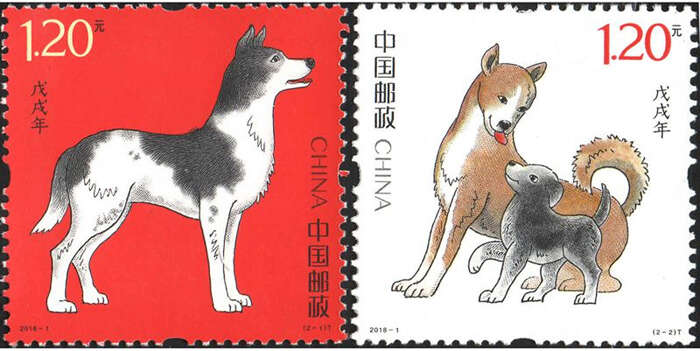 第一枚邮票名称为:“犬守平安”,画面中的公犬昂首挺胸,目光炯炯注视前方,好像随时能离地飞奔、抵御外敌、守护家宅;第二枚名称为:“家和业兴”,棕色母犬深情凝视幼崽;黑色小狗昂头挺立,活泼可爱,母子相依,舐犊情深。