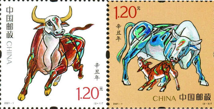 邮票一套2枚,第一枚名称为:“奋发图强”,描绘了雄壮有力、一往无前的奔牛形象,公牛四蹄扬起,昂首向前,目光炯炯;第二枚名称为:“牛年大吉”,描绘了大牛与小牛舐犊的画面。