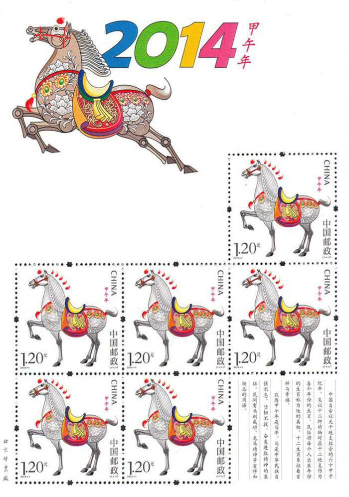 邮票一套1枚。马是中华民族自强不息、坚韧不拔、奋发进取精神的象征。本套邮票设计独具匠心,造型汲取了我国古代马雕塑的精髓,并参考唐三彩马的特征,运用富含吉祥寓意的传统装饰图案,表现出了马的俊朗、强健与吉祥。白马面颊俊秀、筋骨雄强、体态优雅、气宇轩昂,装饰在马身上的牡丹、蝙蝠,表达了“马上得福”、“吉祥富贵”的美好祝愿。生肖邮票马的设计不仅具有鲜明的传统艺术特色,并且融合了现代人文情怀。