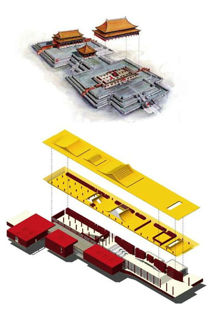 和原故宫本体的南北朝向轴线,故宫博物院北院区东西横放,可建设用地地块狭长、形状不规则,东西长约900米,而南北最窄处仅60米。在狭长的地形里如何满足一座现代化博物馆的功能?设计团队反复考量后,在建筑的最终设计规划中,将对外文物展览布置在了场地东侧,较为私密的文物库房、修复及后勤功能则布置在场地西侧,最大限度满足功能布局的同时,也有利于分期建设。这种南侧临水、北面叠山的线性格局,同样呼应了中国传统“堪舆”理论的理想布局。博物馆群落的金顶建筑形成一条轴线,作为整个建筑体量的中枢。“轴线是形制的根基。故宫有一条中轴线,北院区的中轴线也是寓意故宫核心‘天际线’。我们想通过这种均衡的轴线布局方式与散点的构成逻辑向紫禁城致敬,也是在传承着故宫的历史文化底蕴。”
