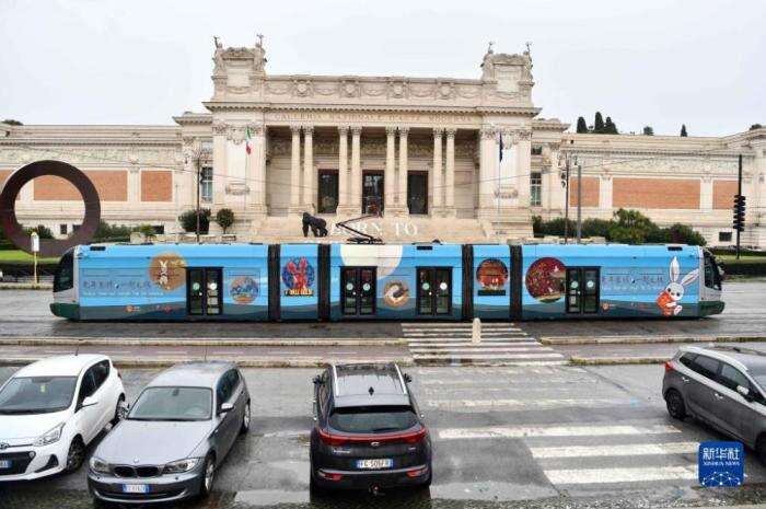 1月17日,兔年春节主题电车驶过意大利罗马的国立现代艺术美术馆。当日,兔年春节主题电车亮相意大利首都罗马,庆祝即将到来的中国农历新年。新华社记者金马梦妮摄