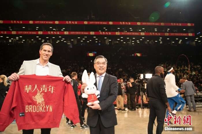 当地时间1月26日,NBA布鲁克林篮网队在位于纽约布鲁克林区的主场巴克莱中心举办庆祝中国兔年春节赛活动。图为中国驻纽约总领事黄屏在赛前发表贺辞后与篮网队CEO山姆•祖斯曼互赠新年礼物。 中新社记者廖攀摄