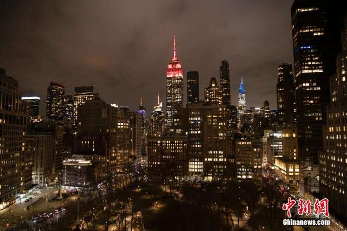 中国驻纽约总领馆与纽约帝国大厦联合举办庆祝中国农历兔年新春点灯仪式,帝国大厦连续23年亮起庆祝中国春节的“中国红”。 中新社记者廖攀摄