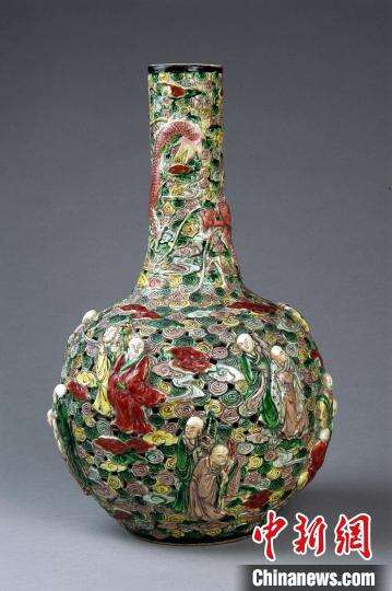 图为清代五彩透雕十八罗汉云龙纹天球瓶。 孙艳 摄