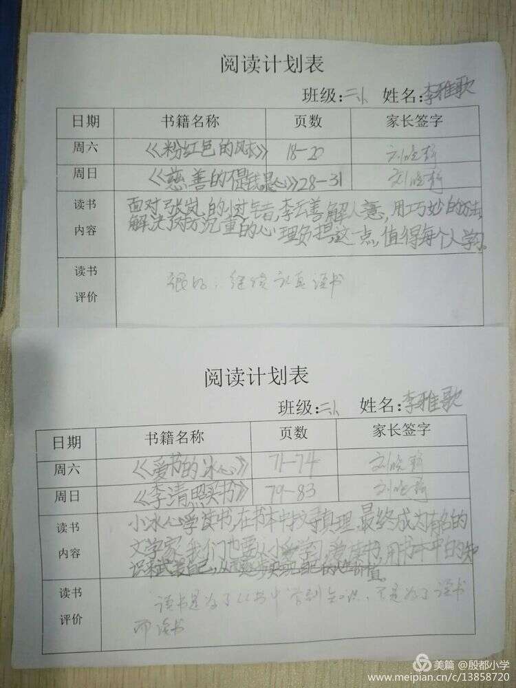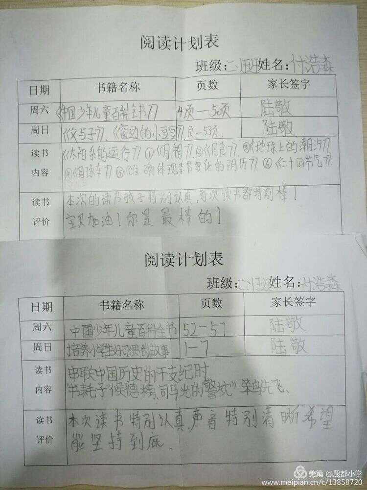 孩子们不仅在校阅读课外主题书籍,每周末回家也阅读课外书并能够认真地填写阅读计划表