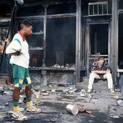 纽约布鲁克林黑人社区生活着各个族群的人:黑人、意大利移民、韩国人…..意大利移民Sal(丹尼·爱罗DannyAiello饰)和他的两个儿子在这里经营一家比萨店很久了,Mookie(斯派克·李SpikeLee饰)在店里负责送外卖,经常和Sal的儿子闹矛盾。RadioRaheem(BillNunn饰)是一个喜欢提着一个收音机大声放着音乐到处走的年轻人。炎热的一天,黑人小伙Buggin’Out(吉安卡罗·埃斯波西托GiancarloEsposito饰)发现比萨店墙上挂着的名人照片里没有一个黑人,十分不满;而Radio来到比萨店,却被Sal要求关掉收音机。心怀不满的Buggin’Out和Radio决定找Sal讨个说法,三人在争执中,Sal把Radio的收音机砸烂了。Radio大怒,便和Sal打了起来。警察赶来了,围观的人也越…
