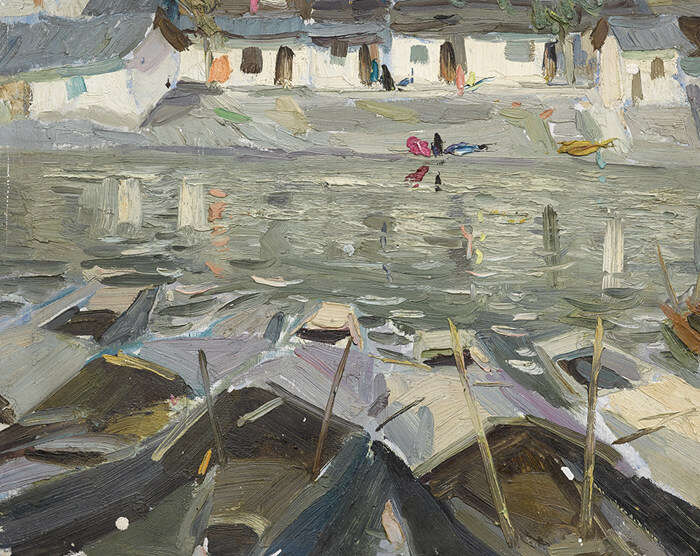 《雨过乌镇》 谌北新 纸板油画 33×41cm 1982年