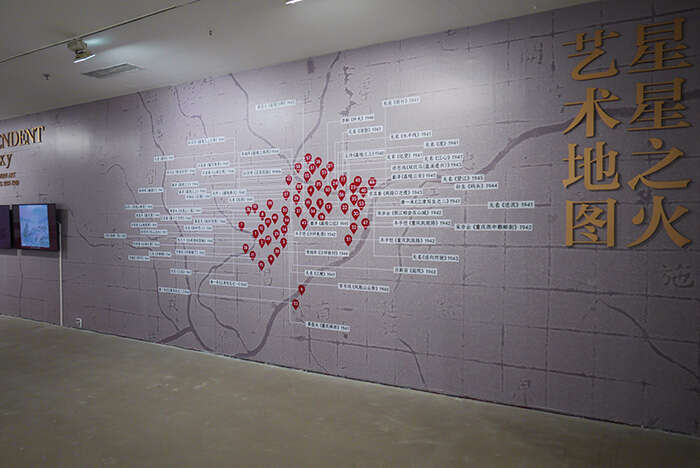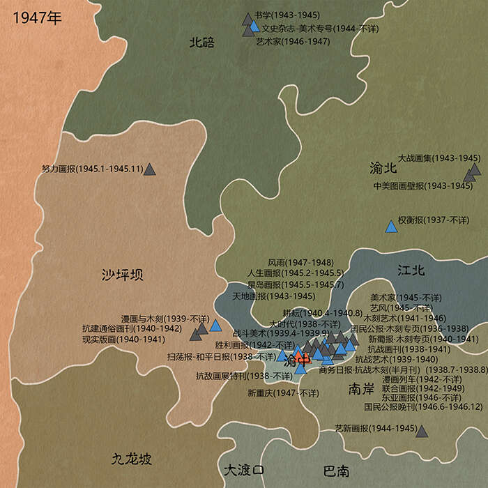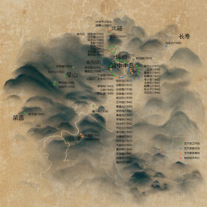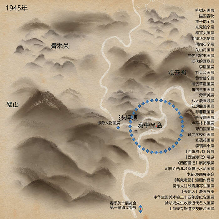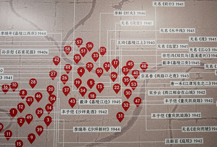展览的第四个板块以新艺术史“艺术地理学”的研究方法切入,以重庆地图为蓝本,运用 GIS (地理信息系统)技术,展现美术学校校址、艺术家在渝创作地点、艺术展览举办地点、艺术刊物创刊地、艺术团队的分布与汇集,对历史文献资料进行整合,形成了可视化的艺术地图,还原艺术家在重庆生活和创作的原境,让观众感受各种艺术史要素在空间上的互动,研究环境对艺术创作的影响。